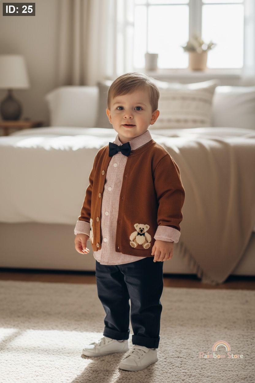 قميص كلاسيكي مع ربطة عنق وسترة بنية بتطريز دبدوب لطيف 🧸