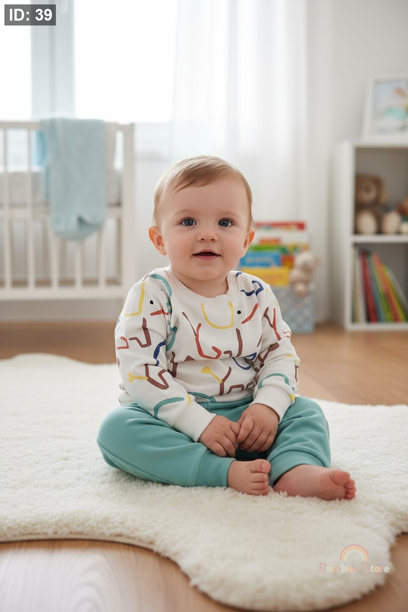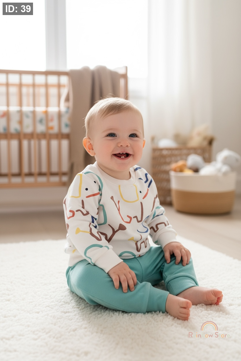 طقم مميز من بلوزة بيضاء برسومات ملونة وبنطال فيروزي ناعم، يمنح طفلك أناقة فنية ولمسة مرحة كل يوم.