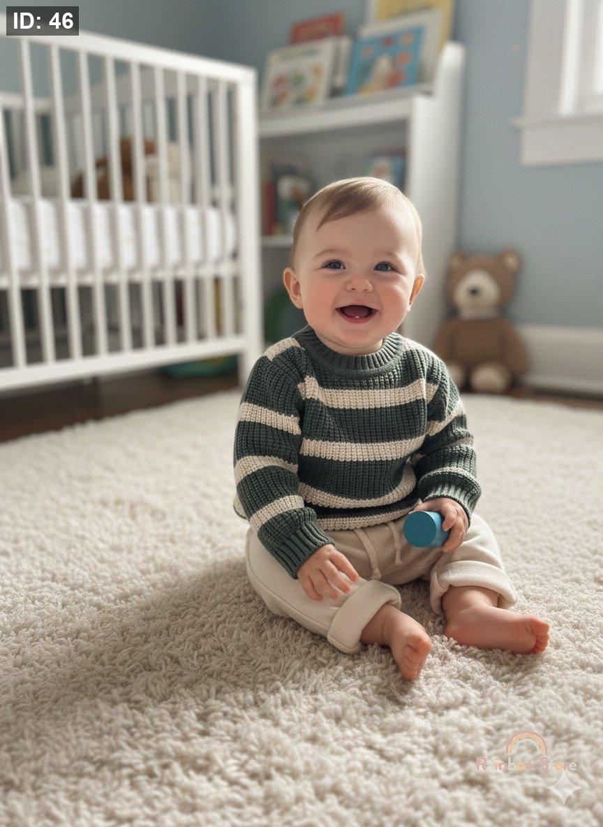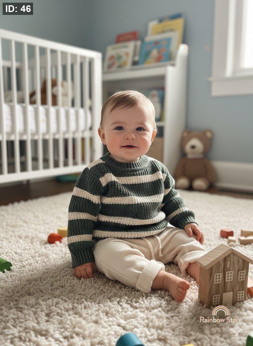 بلوزة صوفية مخططة بألوان الخضار الهادئ والأبيض، مع بنطال قطني مريح بلون عاجي ناعم. تصميم دافئ وأنيق لطفلك الصغير، مثالي لأيام البرد والمشاوير الجميلة. ❄️
