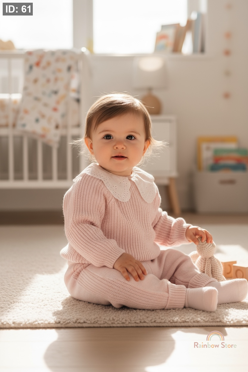 طقم تريكو زهري فاتح بياقة بيضاء تضيف لمسة كلاسيكية ناعمة.