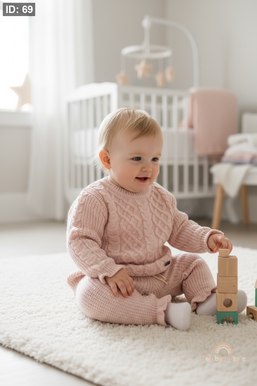 طقم بناتي شتوي محبوك بلون وردي ناعم.