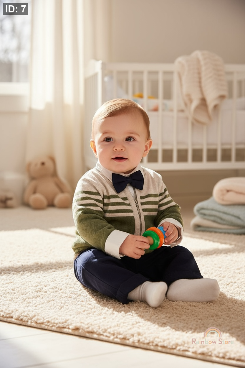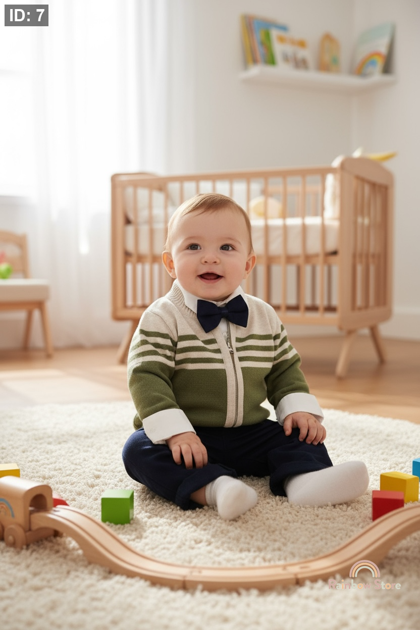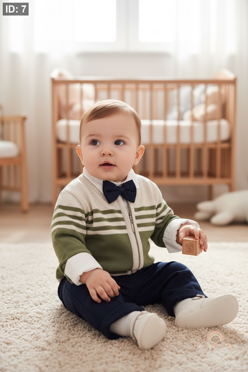 طقم أولادي أنيق بتصميم كلاسيكي من قطعتين، كنزة زيتية مع فيونكة وبنطال كحلي أنيق.